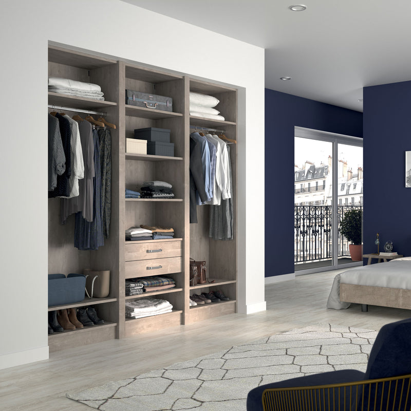 Aménagement 3 espaces, profondeur 595 mm, Bois Flotté Crème, 3 tringles - 9 étagères - 2 tiroirs
