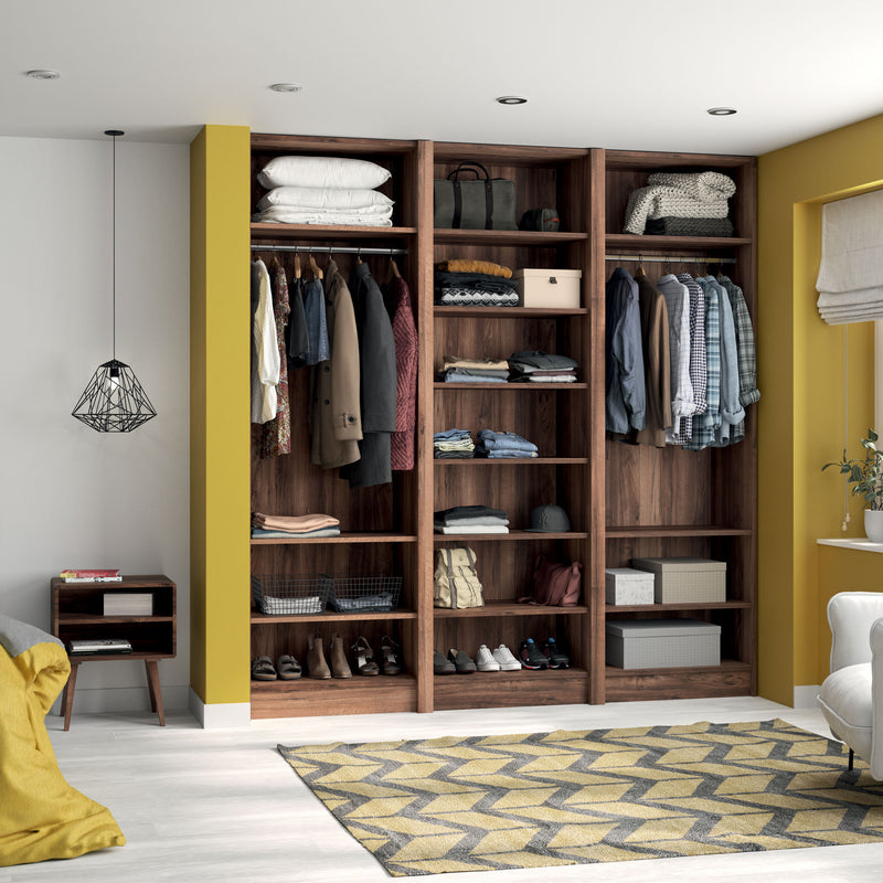 Aménagement 3 espaces, profondeur 550 mm, Noyer des Andes, 2 tringles - 12 étagères