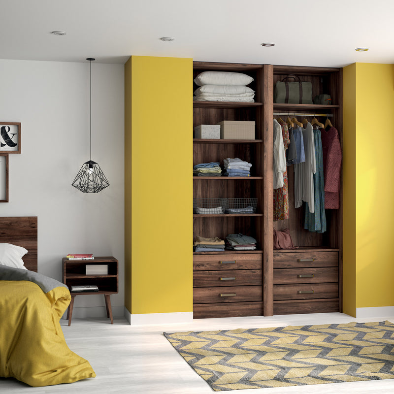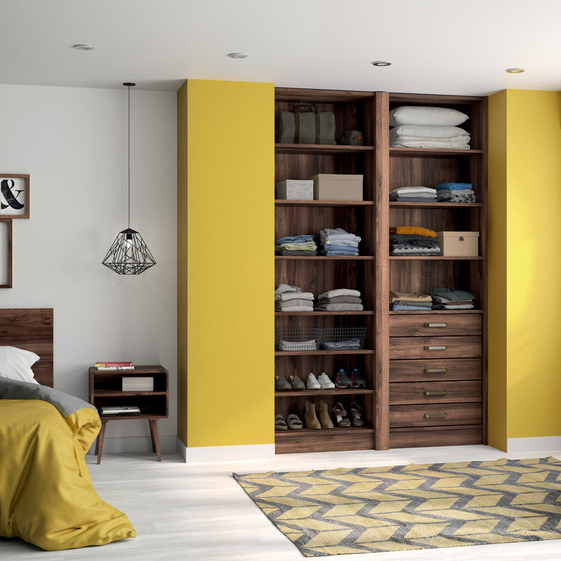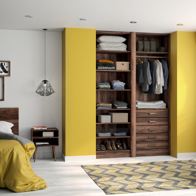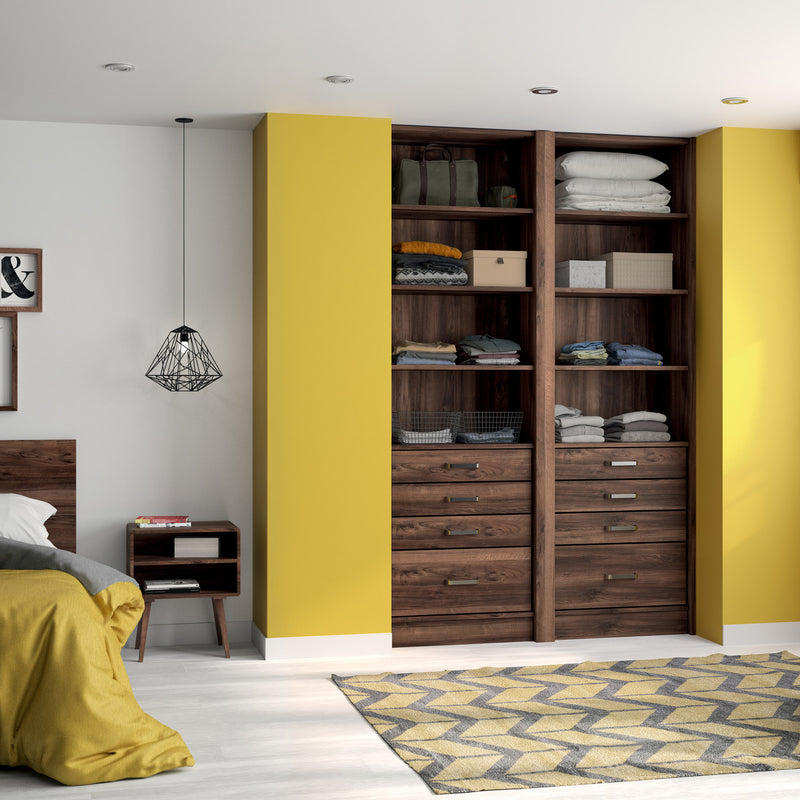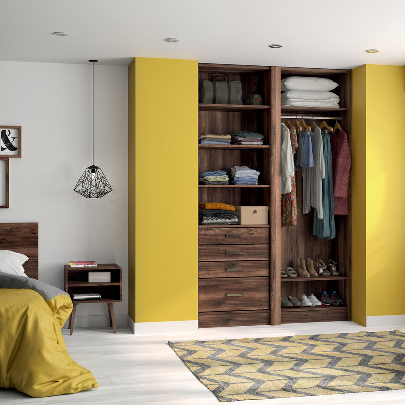 Aménagement 2 espaces, profondeur 465 mm, Noyer des Andes, 1 tringle - 6 étagères - 4 tiroirs