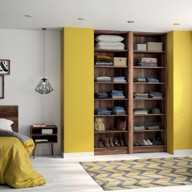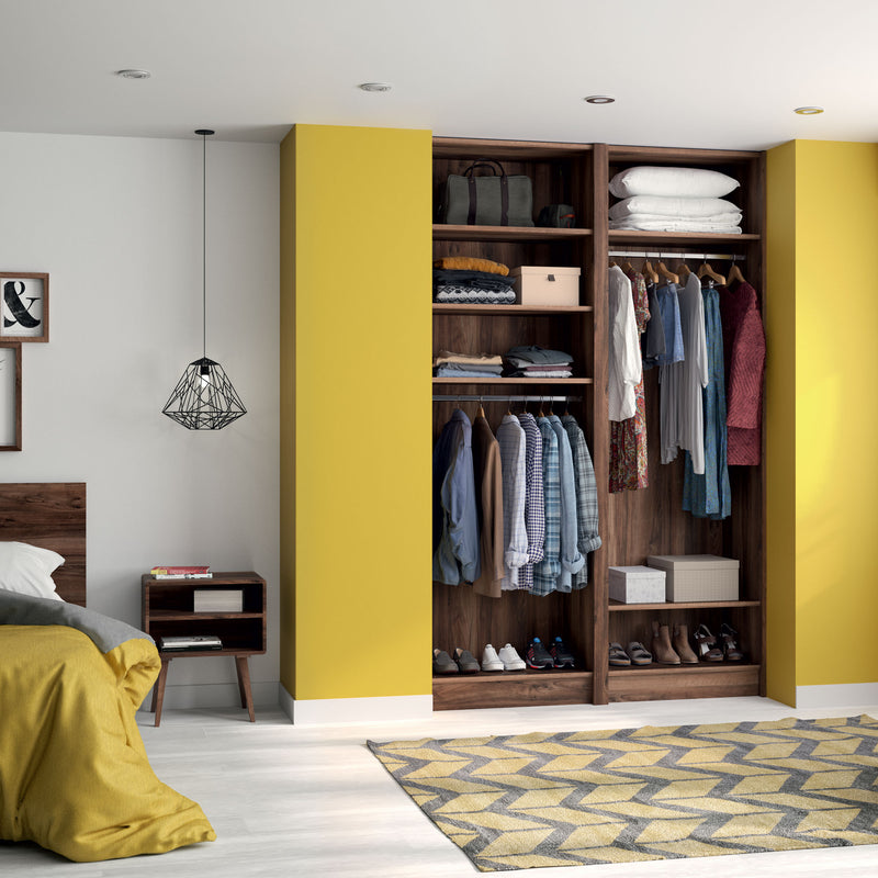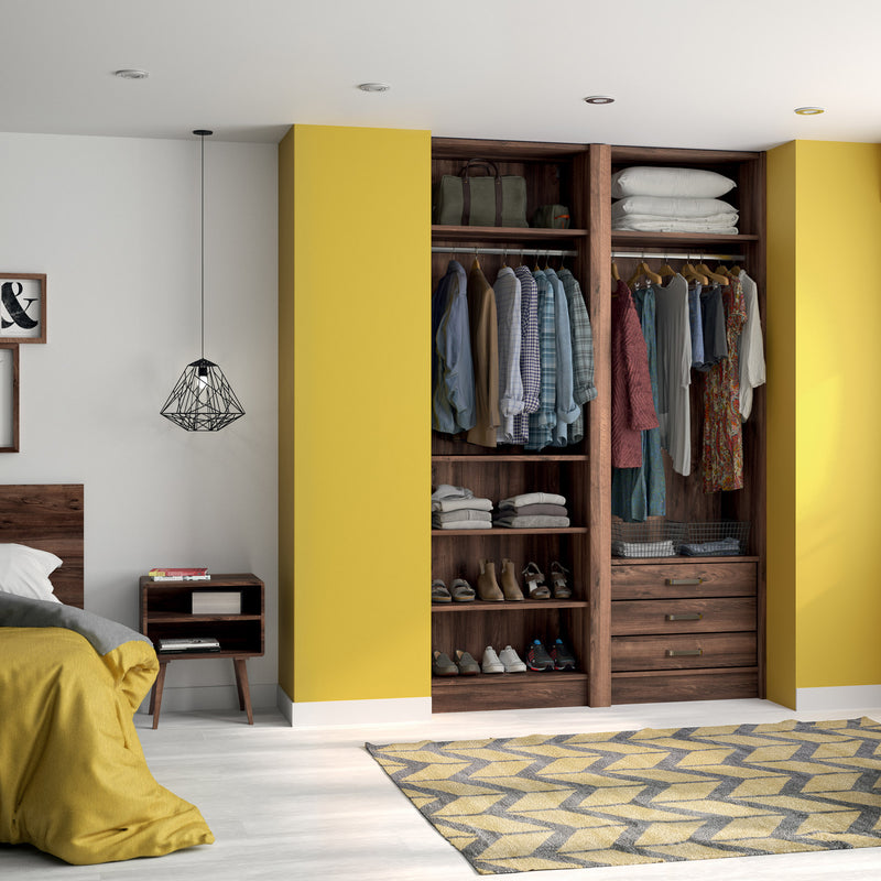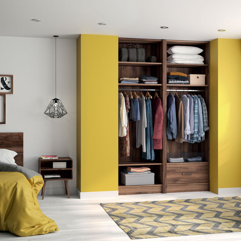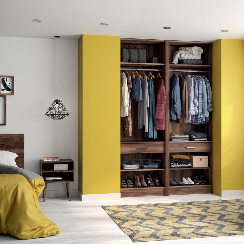 Aménagement 2 espaces, profondeur 465 mm, Noyer des Andes, 1 tringle - 6 étagères - 4 tiroirs