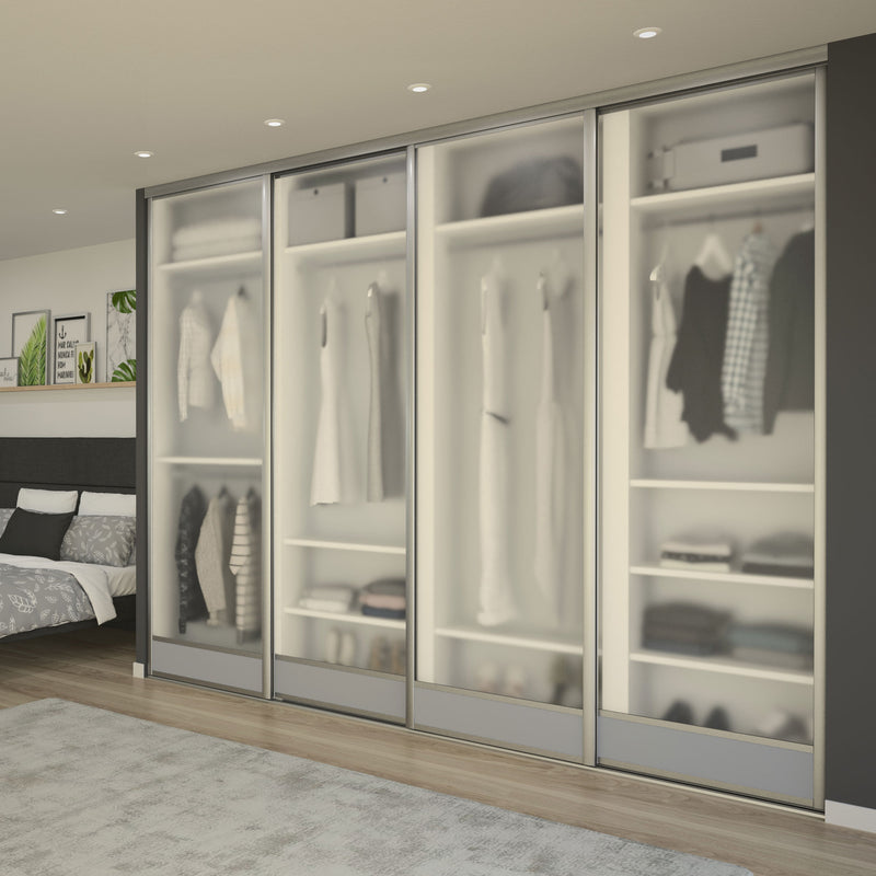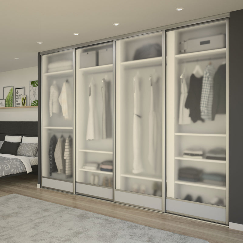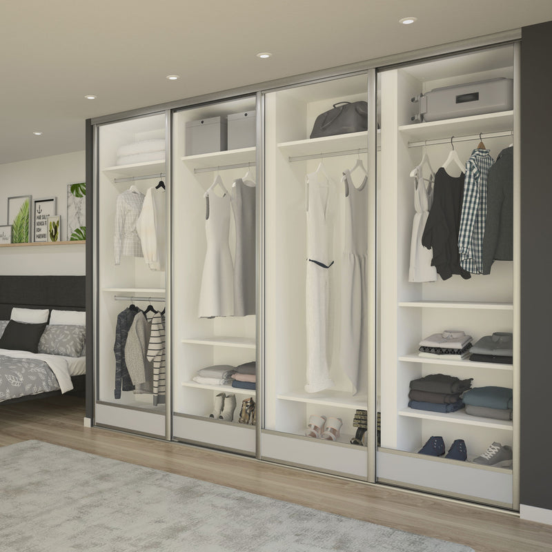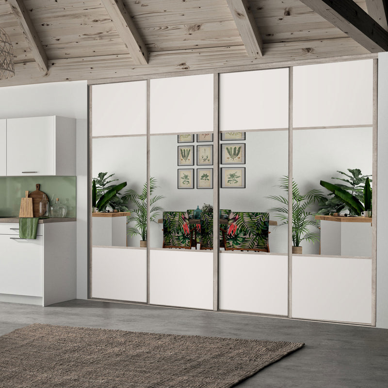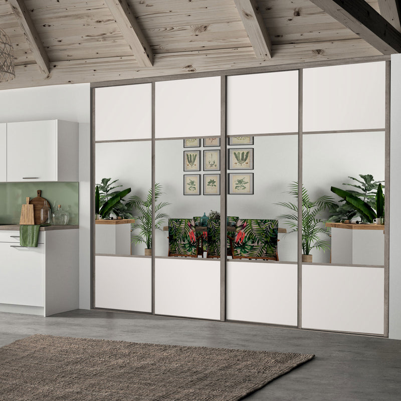 Façade de placard coulissante 4 portes décor blanc mat, miroir argent