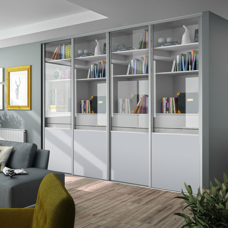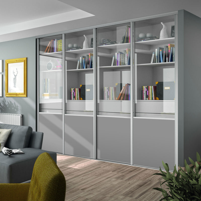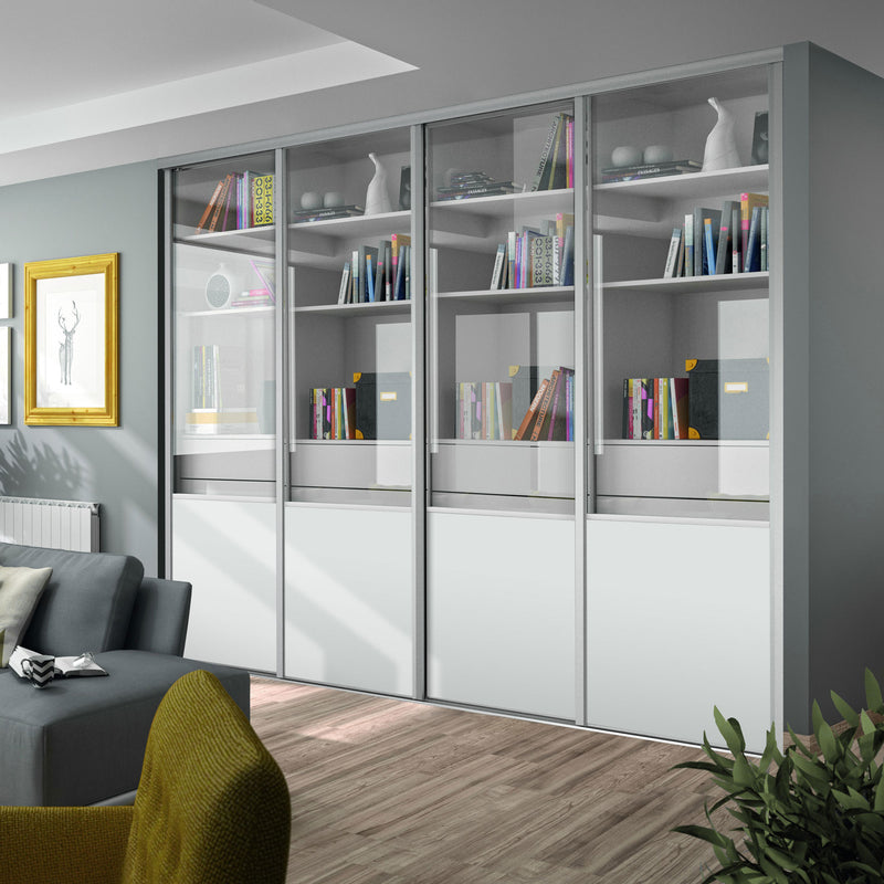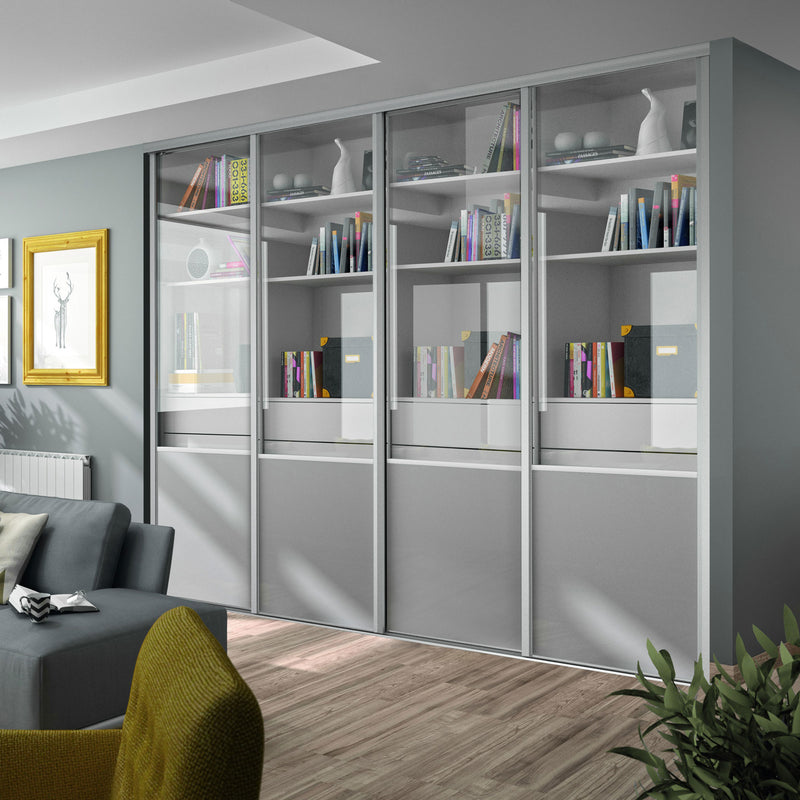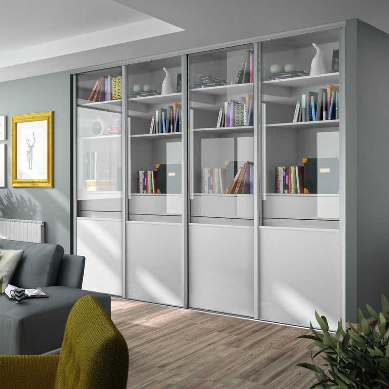 Façade de placard coulissante 4 portes décor blanc mat, miroir argent