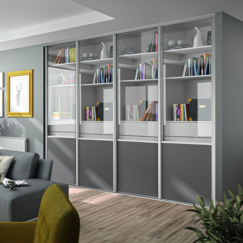 Façade de placard coulissante 4 portes décor gris galet, miroir plomb