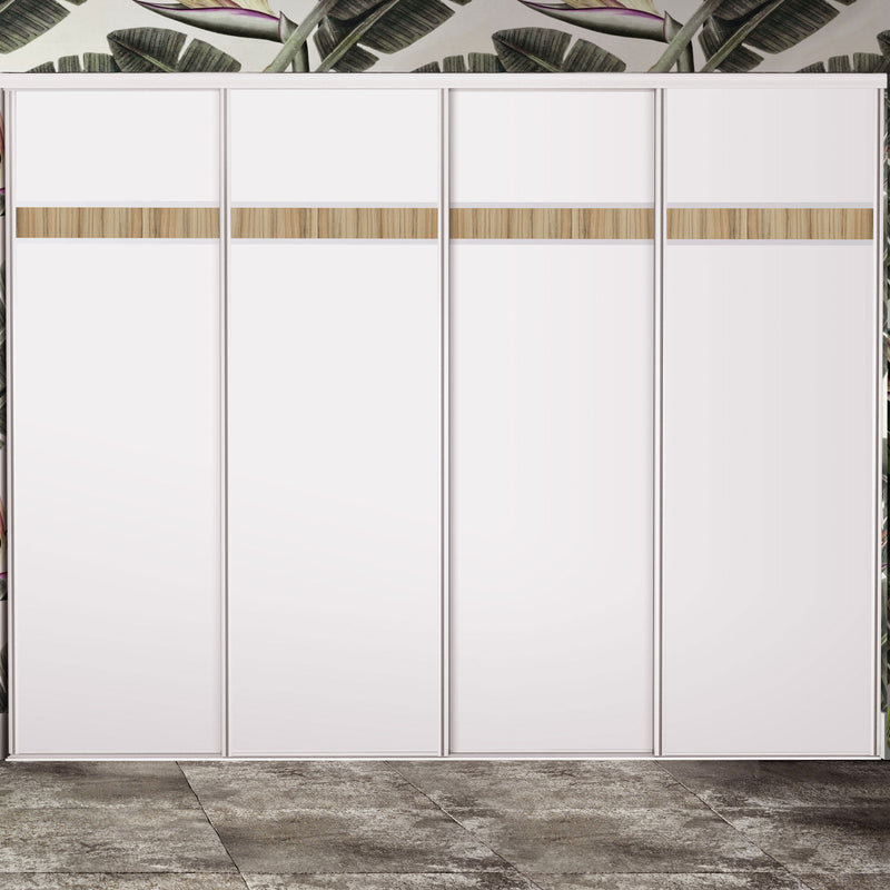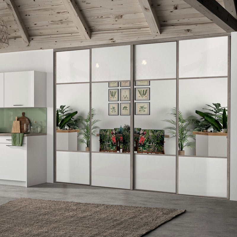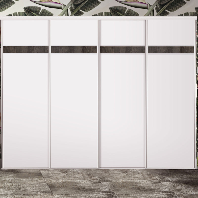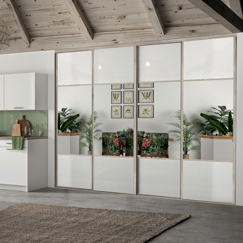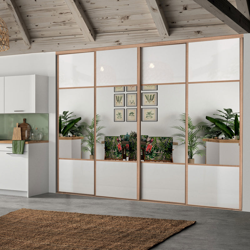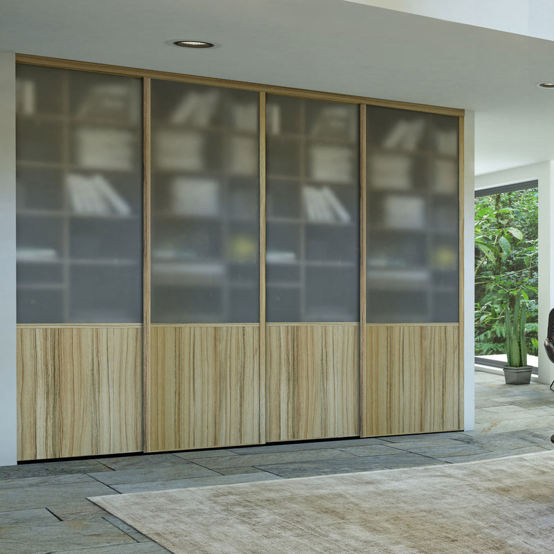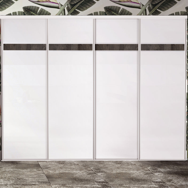 Façade de placard coulissante 4 portes verre laqué blanc pur, décor bois fumé brut