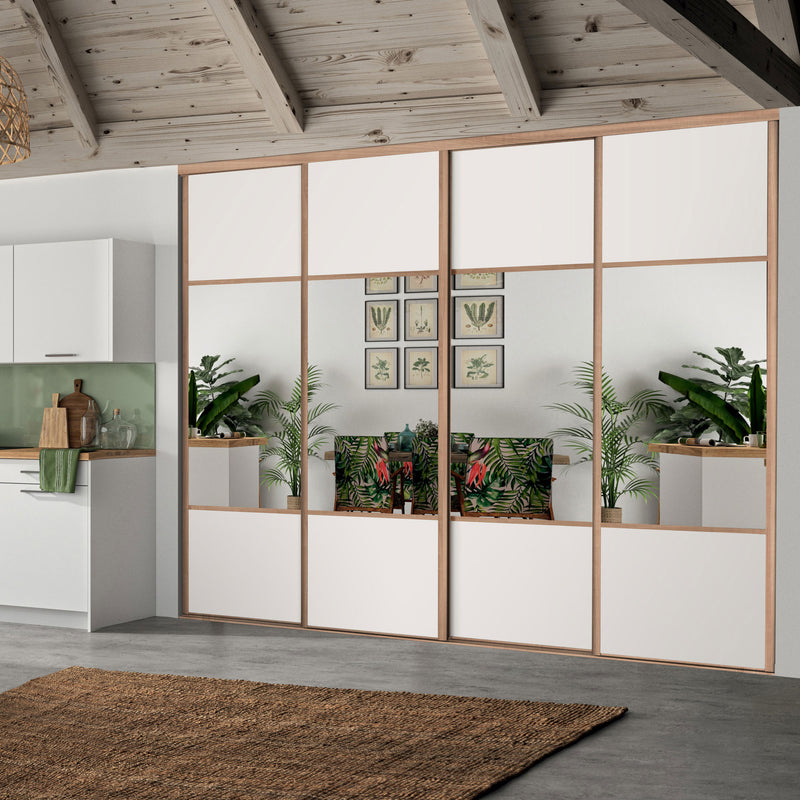 Façade de placard coulissante 4 portes décor chêne blond, miroir argent