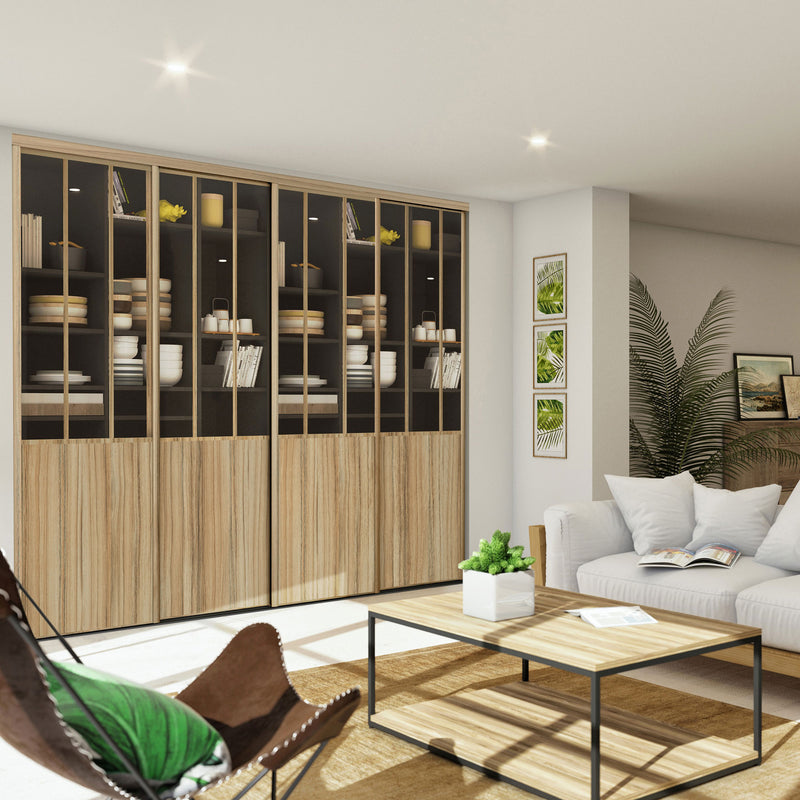 Les façades coulissantes à 4 portes Kazed sont idéales pour les grands espaces de rangement et notamment pour les placards supérieurs à 4 mètres de large ! Grâce à leurs décors variés, elles s’intégreront facilement dans votre maison.
