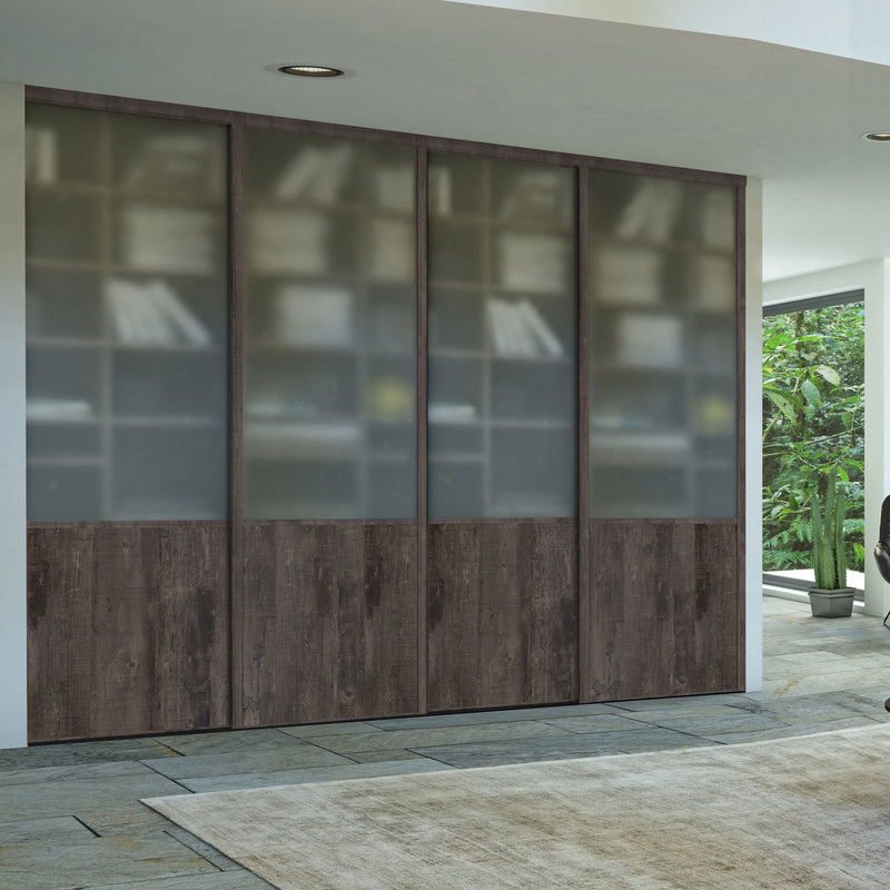 Façade de placard coulissante 4 portes décor blanc mat, décor bois fumé brut
