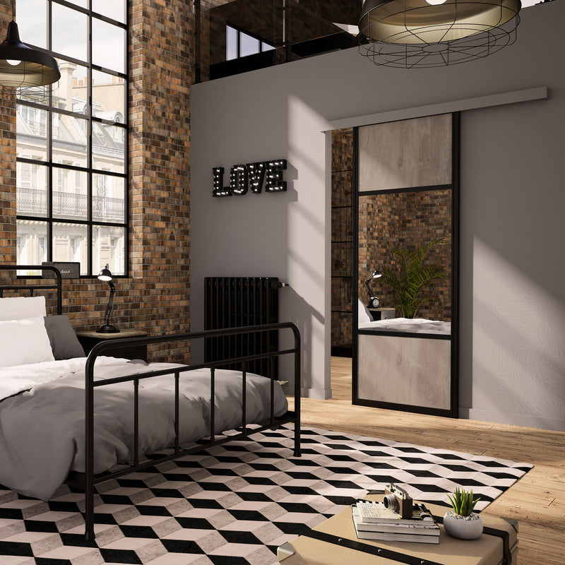 Porte de séparation coulissante et rail applique H2040 x L930 mm - Miroir Argent, Décor Chêne Flanelle Brut