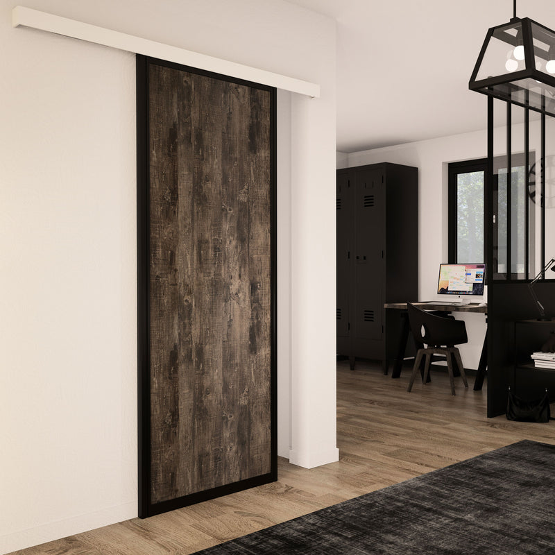 Porte de séparation coulissante et rail applique H2040 x L930 mm - Décor Bois Fumé Brut