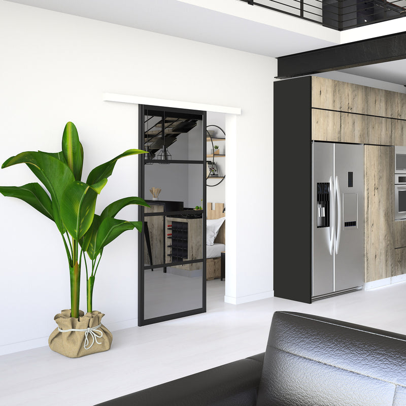 Porte de séparation coulissante et rail applique H2040 x L930 mm - Miroir Plomb, verre laqué noir