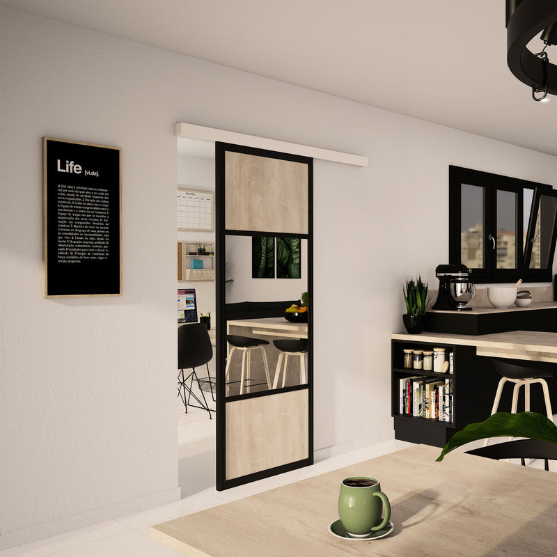Porte de séparation coulissante et rail applique H2040 x L930 mm - Miroir Plomb, décor Noir Intense