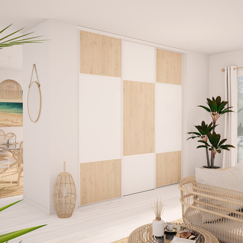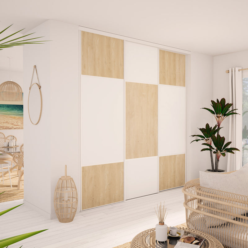 Façade de placard coulissante 3 portes décor blanc mat, décor chêne cigare brut