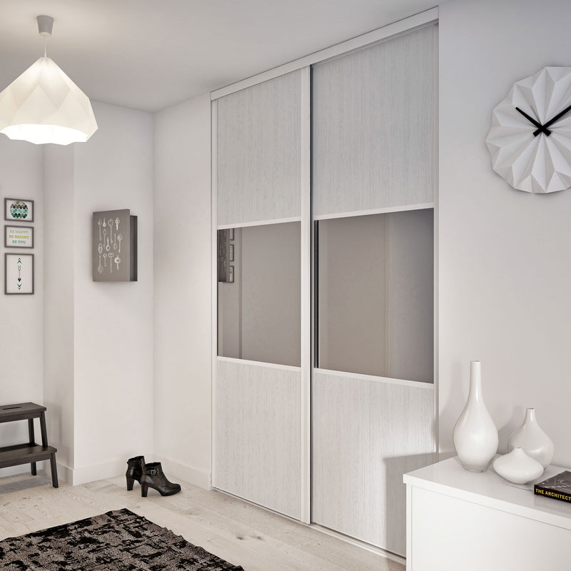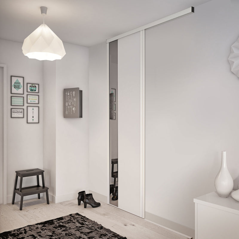 Façade de placard coulissante 2 portes décor blanc mat, miroir argent