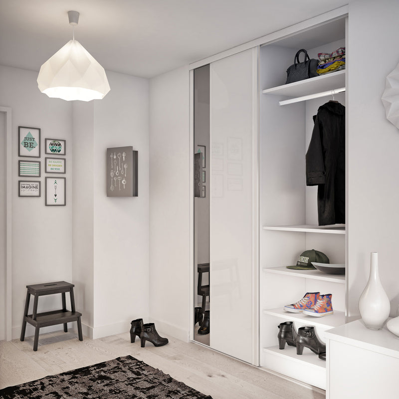 Façade de placard coulissante 1 porte verre laqué blanc pur, miroir argent