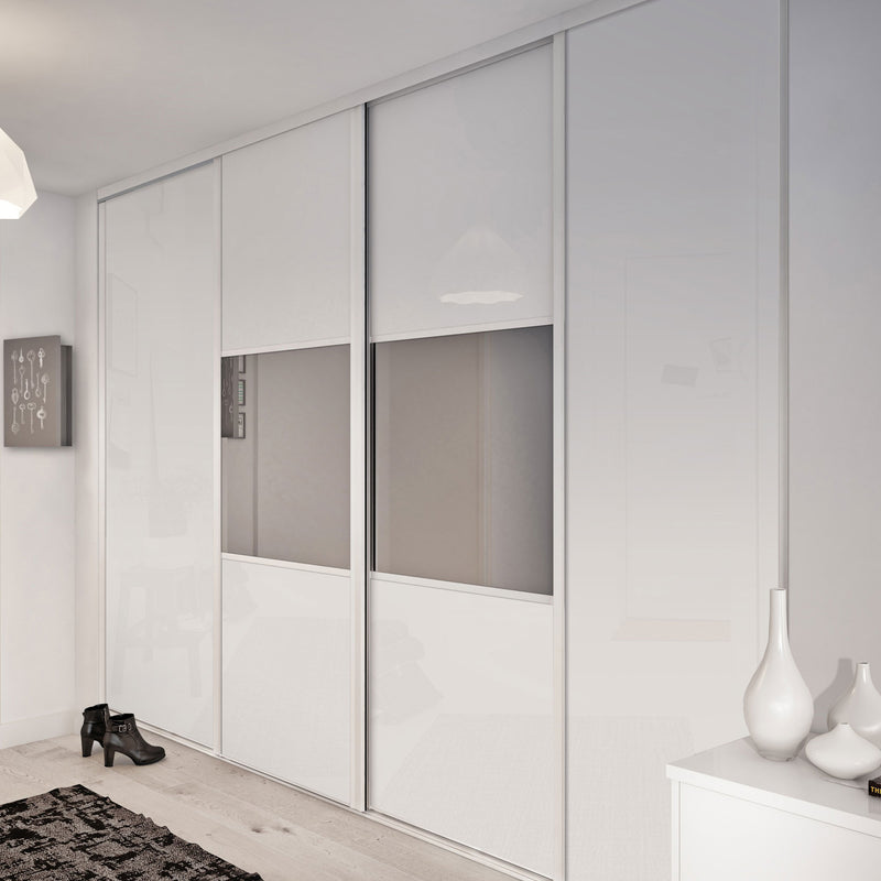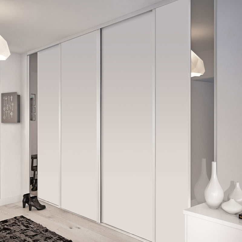 Façade de placard coulissante 4 portes verre laqué blanc pur, miroir argent