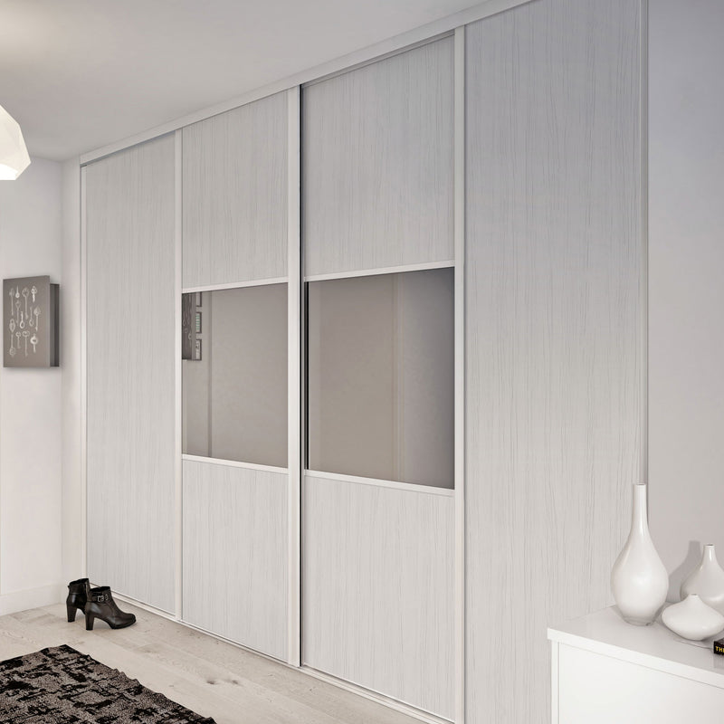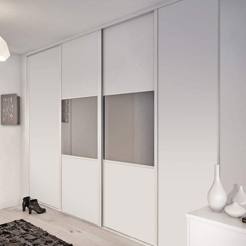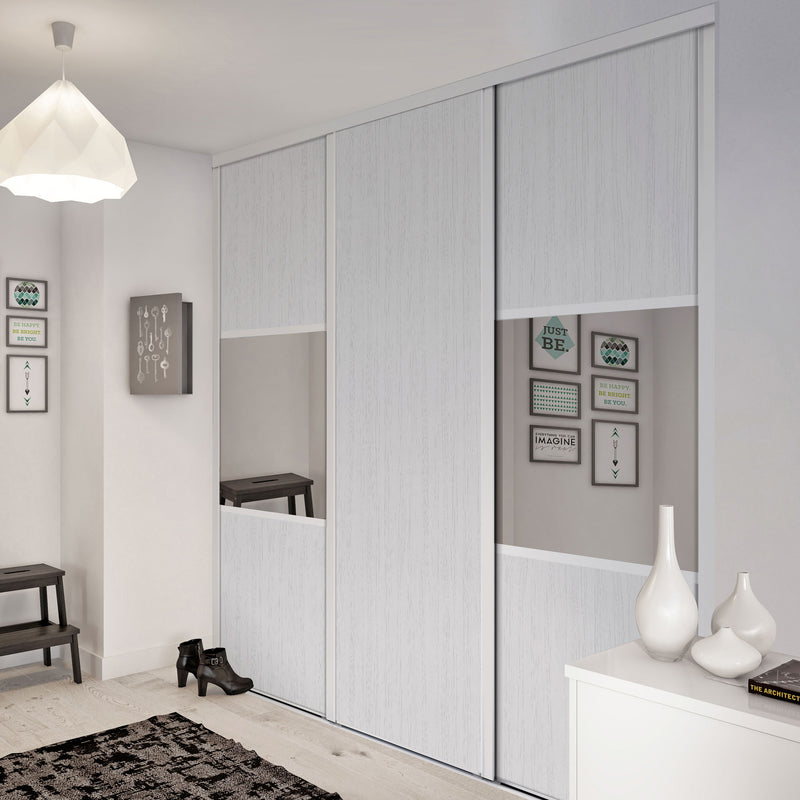 Façade de placard coulissante 3 portes décor blanc mat, miroir argent