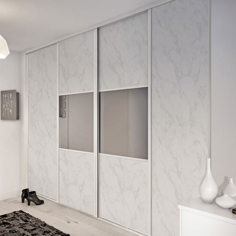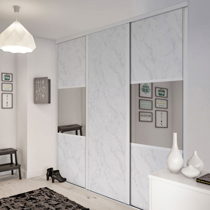 Façade de placard coulissante 2 portes décor marbre blanc, miroir argent