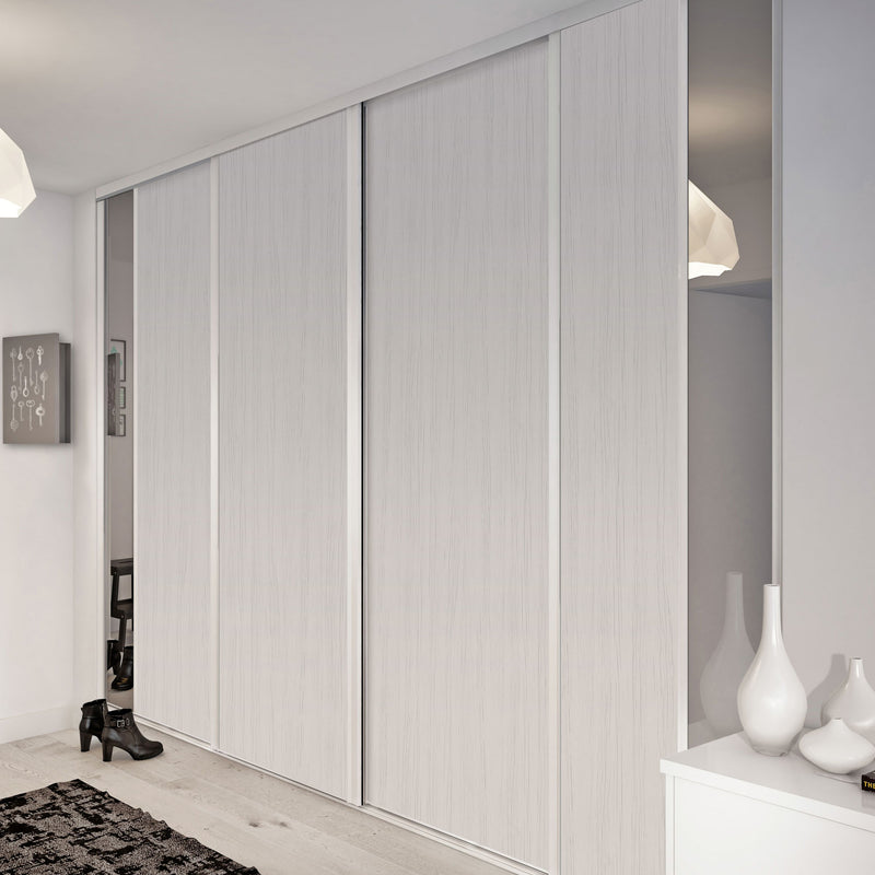 Façade de placard coulissante 4 portes décor blanc mat, miroir argent
