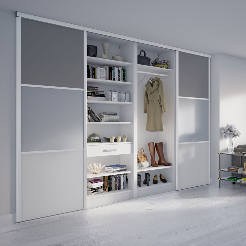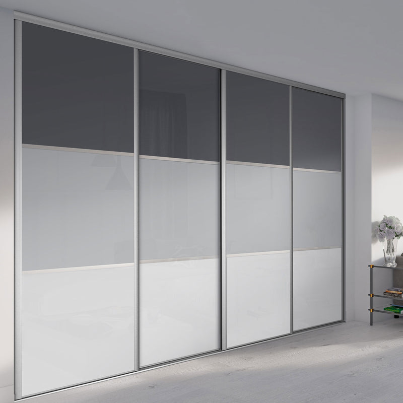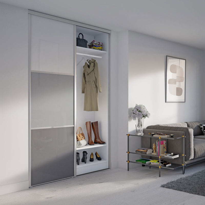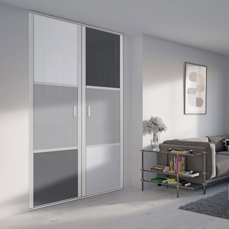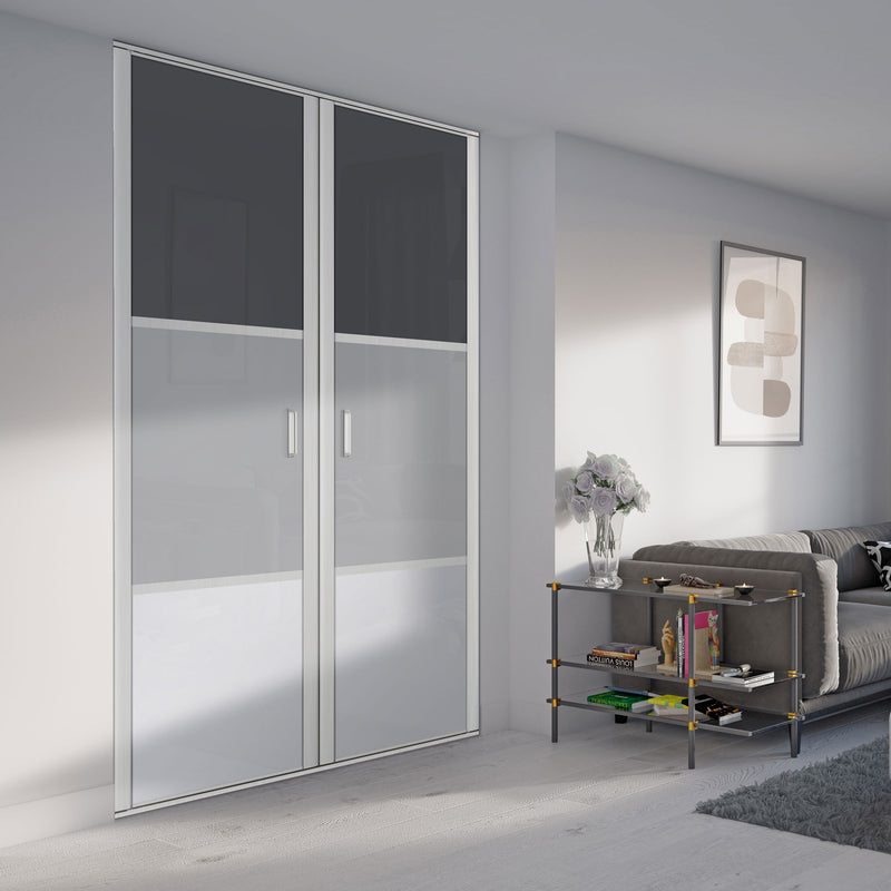 Façade de placard coulissante 2 portes verre laqué blanc pur, verre laqué gris perle, verre laqué gris foncé