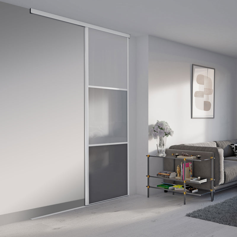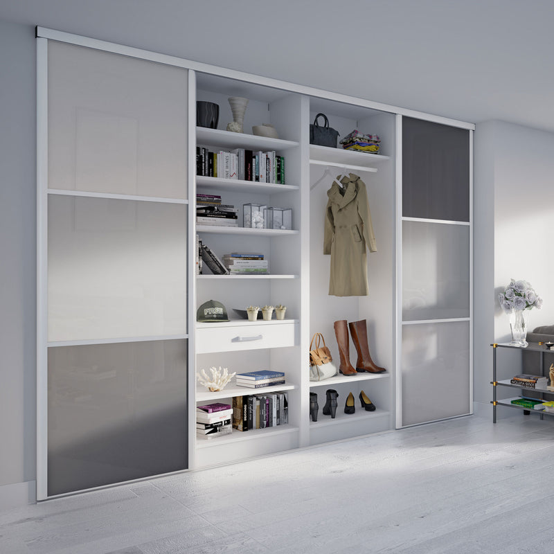 Façade de placard coulissante 3 portes verre laqué blanc pur, verre laqué gris perle, verre laqué gris foncé