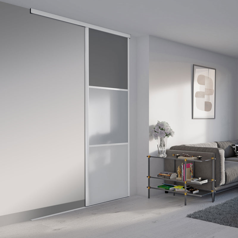 Façade de placard coulissante 1 porte décor blanc mat, décor gris galet, décor gris intense