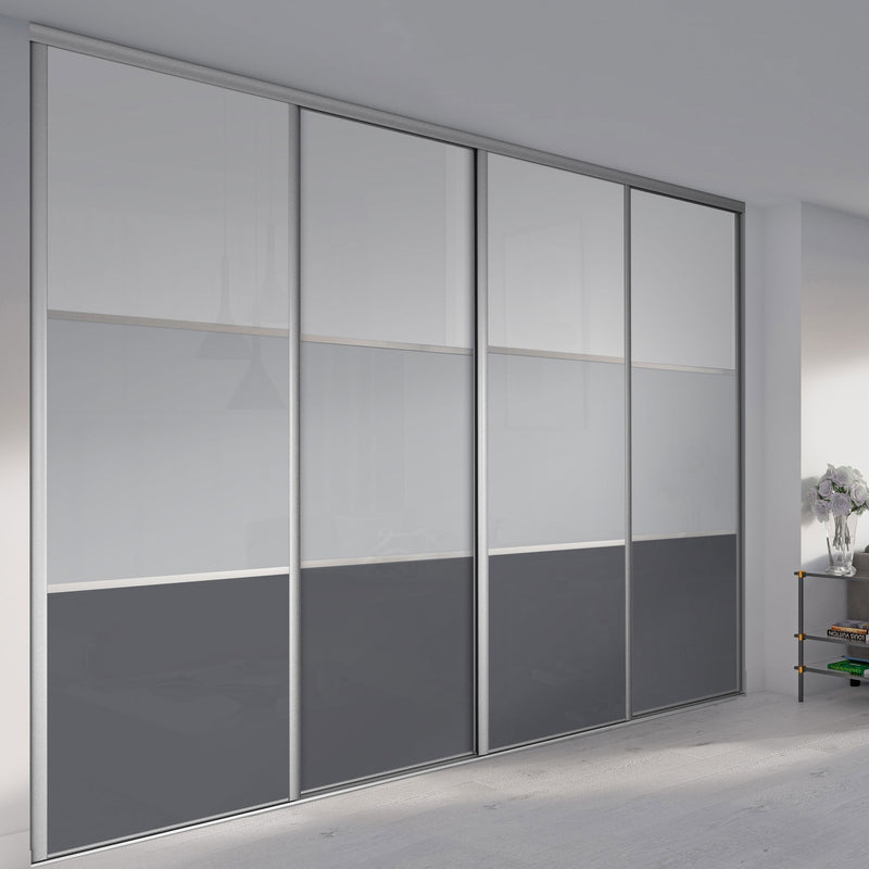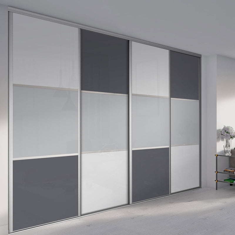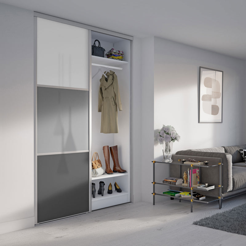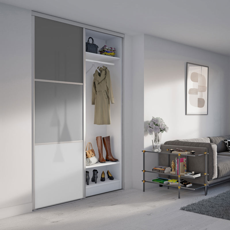 Façade de placard coulissante 3 portes verre laqué gris foncé, verre laqué gris perle, verre laqué blanc pur