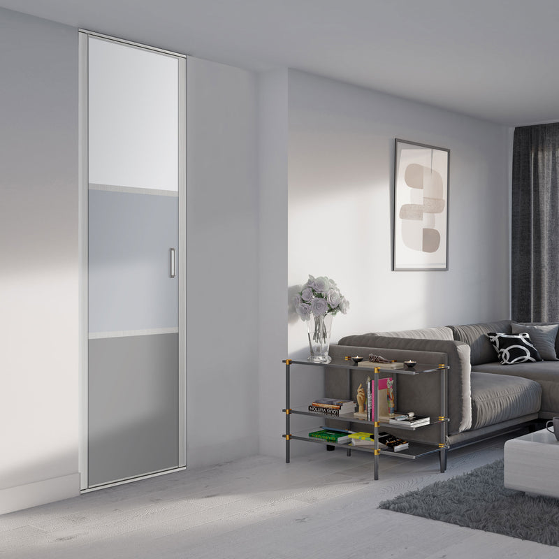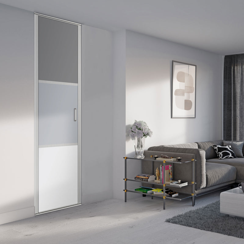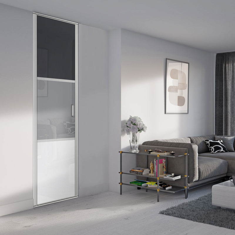 Façade de placard pivotante 1 porte verre laqué blanc pur, verre laqué gris perle, verre laqué gris foncé