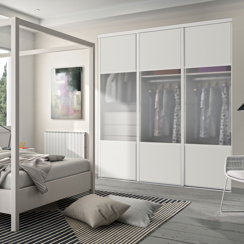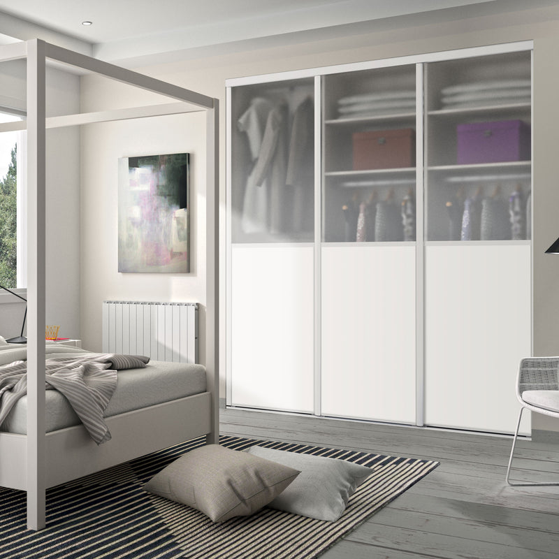 Façade de placard coulissante 3 portes décor blanc mat, vitre dépolie
