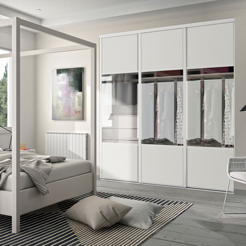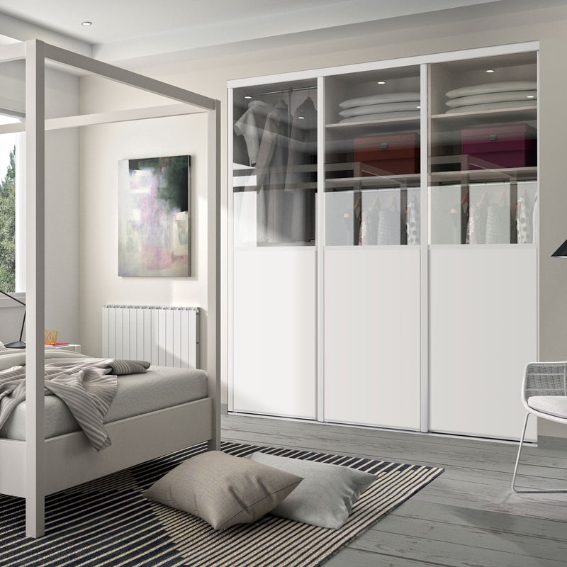 Façade de placard coulissante 3 portes décor blanc mat, vitre claire