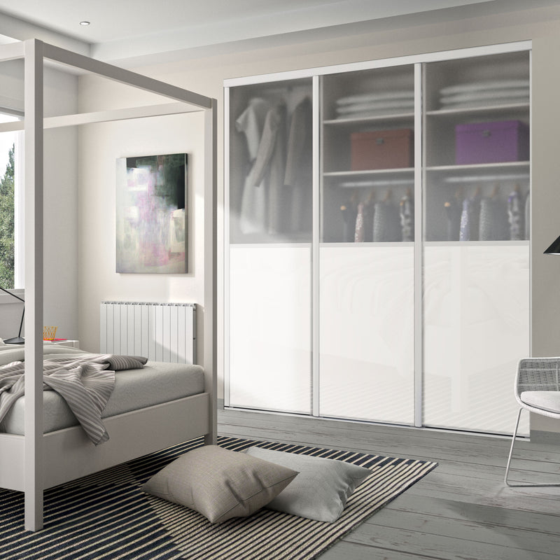 Façade de placard coulissante 3 portes vitre dépolie, verre laqué blanc pur