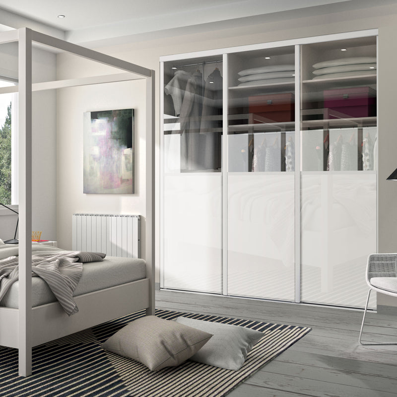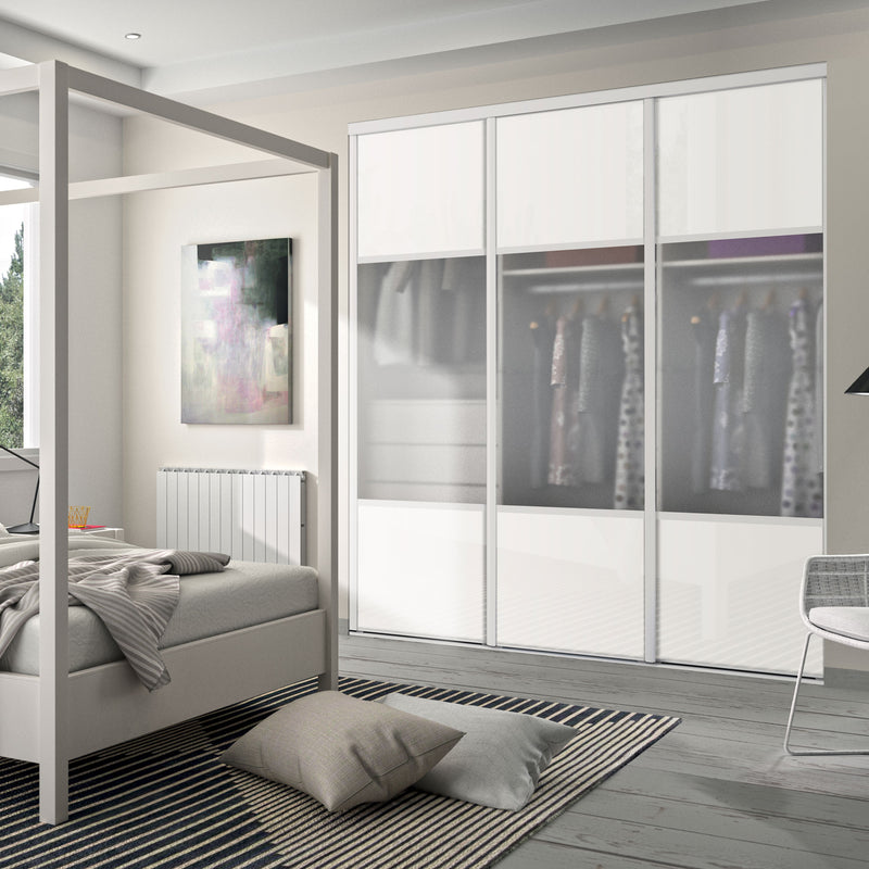 Façade de placard coulissante 3 portes verre laqué blanc pur, vitre dépolie