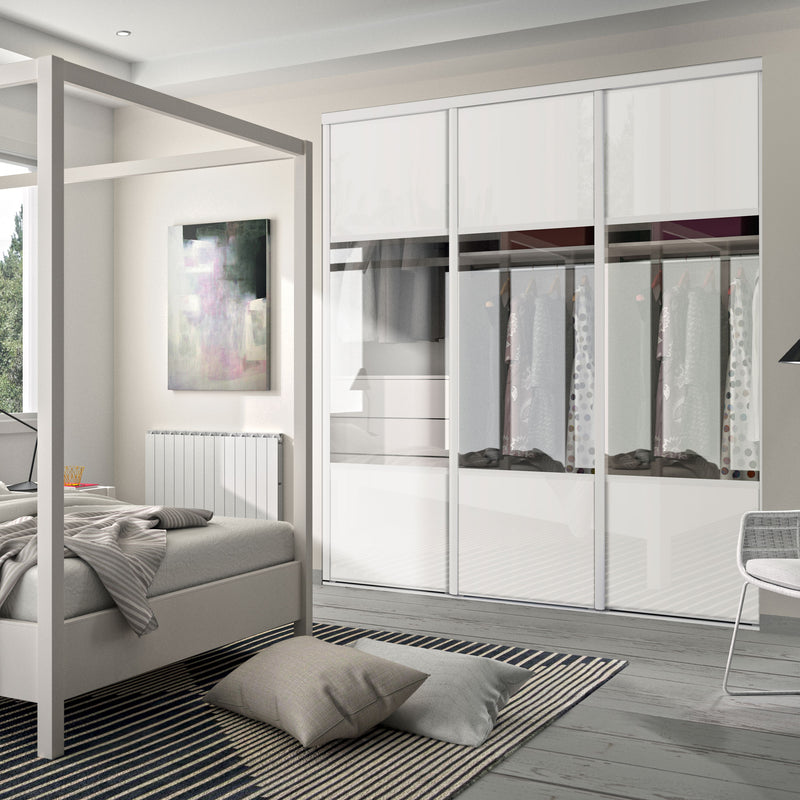 Façade de placard coulissante 3 portes verre laqué blanc pur, vitre claire