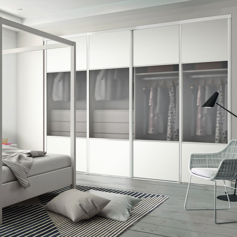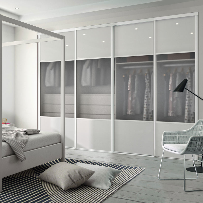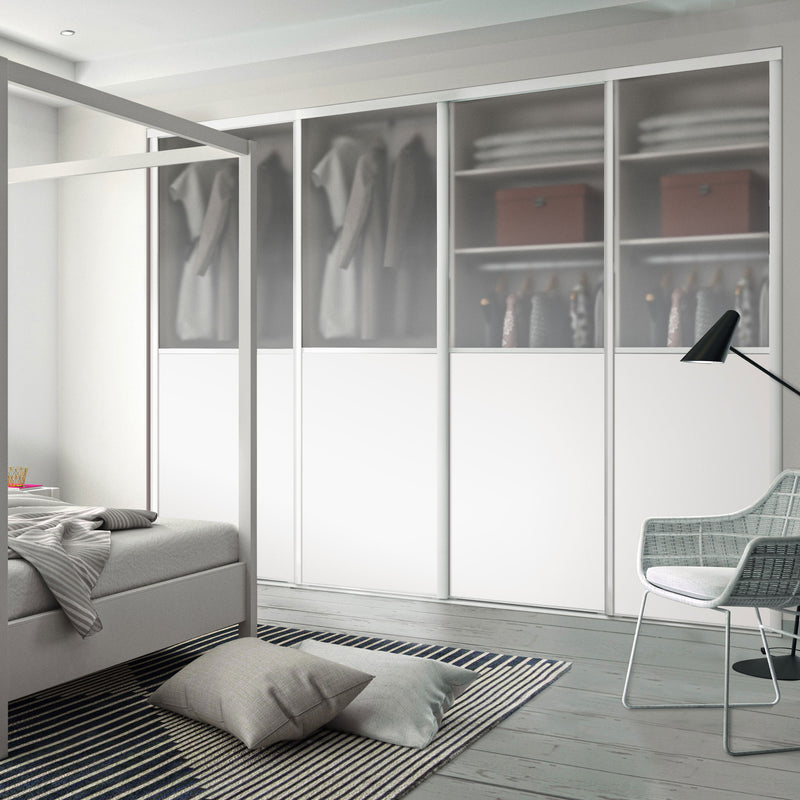 Façade de placard coulissante 4 portes vitre dépolie, décor blanc mat