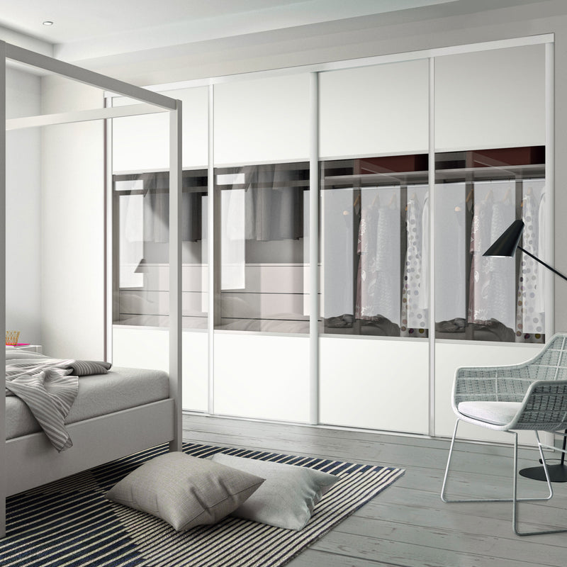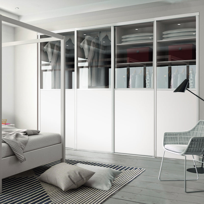 Façade de placard coulissante 4 portes vitre claire, décor blanc mat