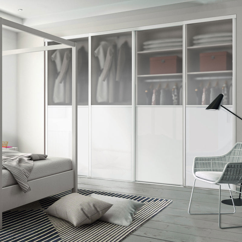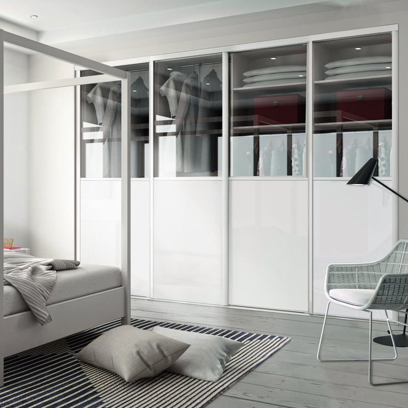 Façade de placard coulissante 4 portes vitre dépolie, verre laqué blanc pur