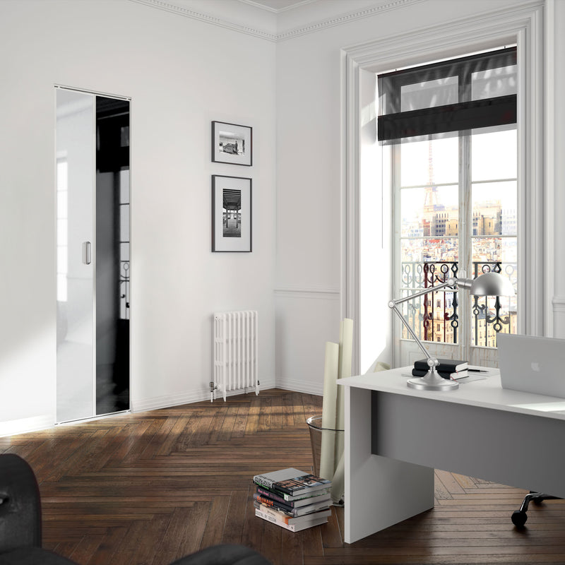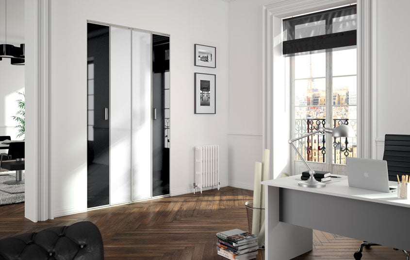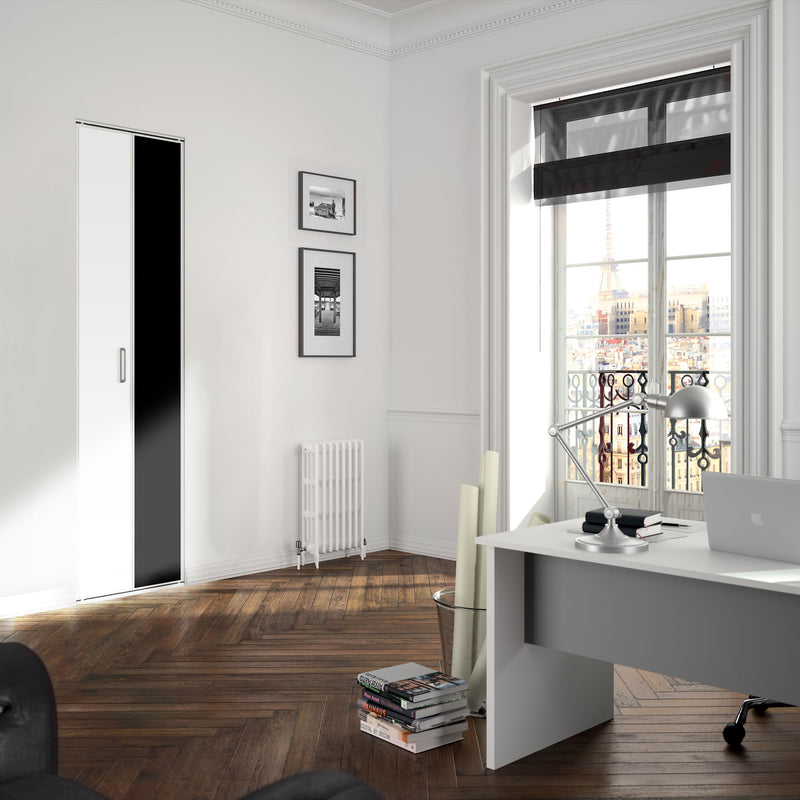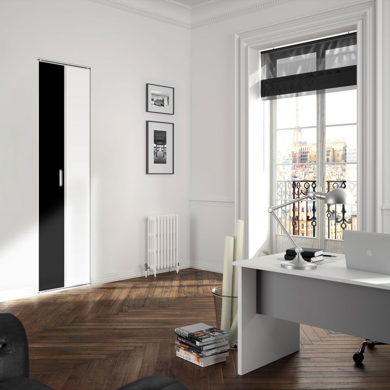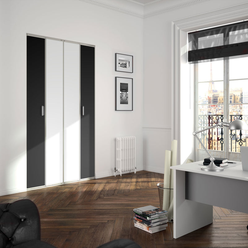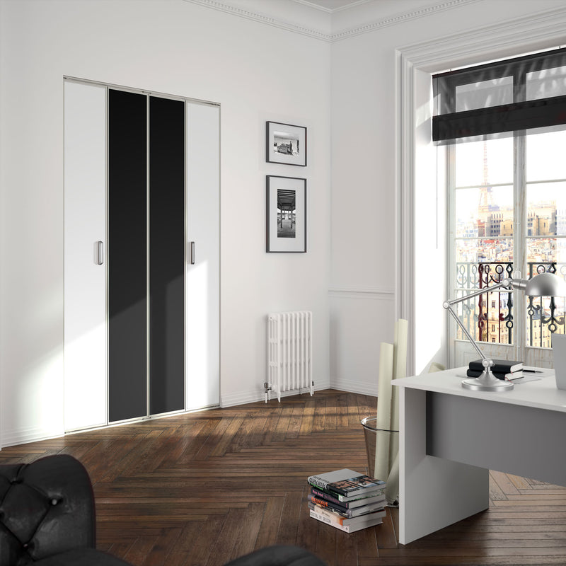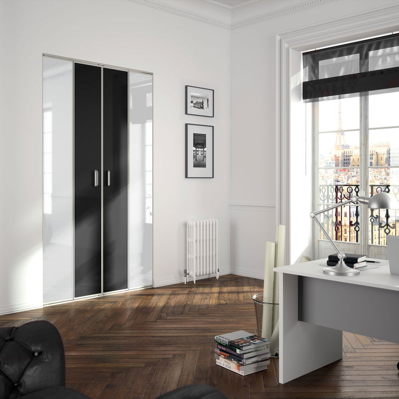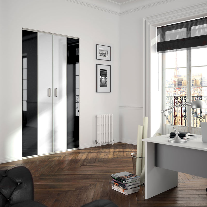 Osez le mélange du Noir et Blanc dans votre déco avec ces portes de placard pliantes Kazed : vous ne pouvez pas vous tromper ! Cette collection toute en contraste et en brillance fera son effet dans votre bureau ! L’ouverture pliante offre un accès quasi-total à votre rangement.