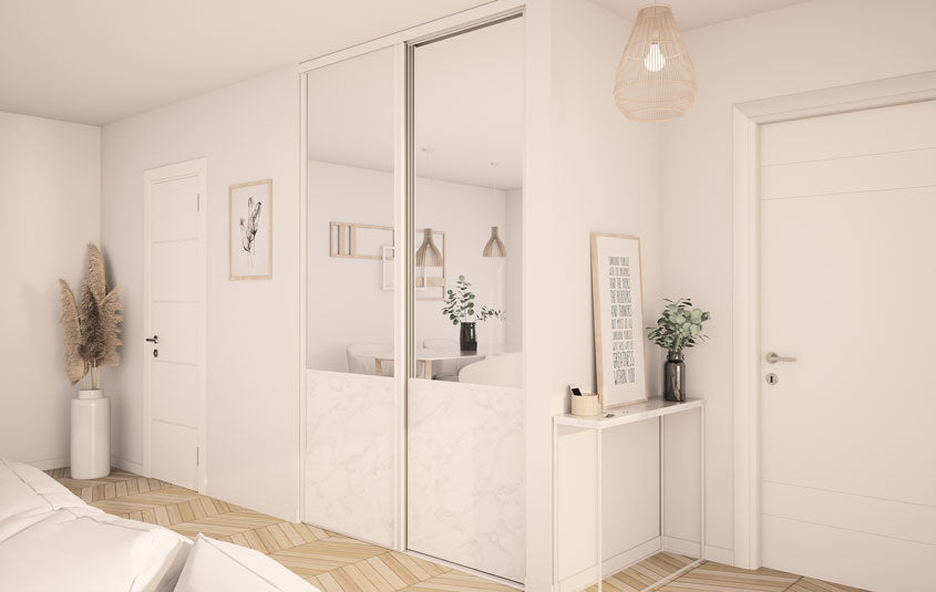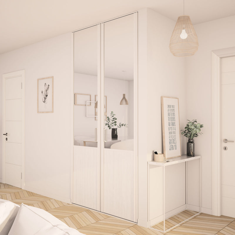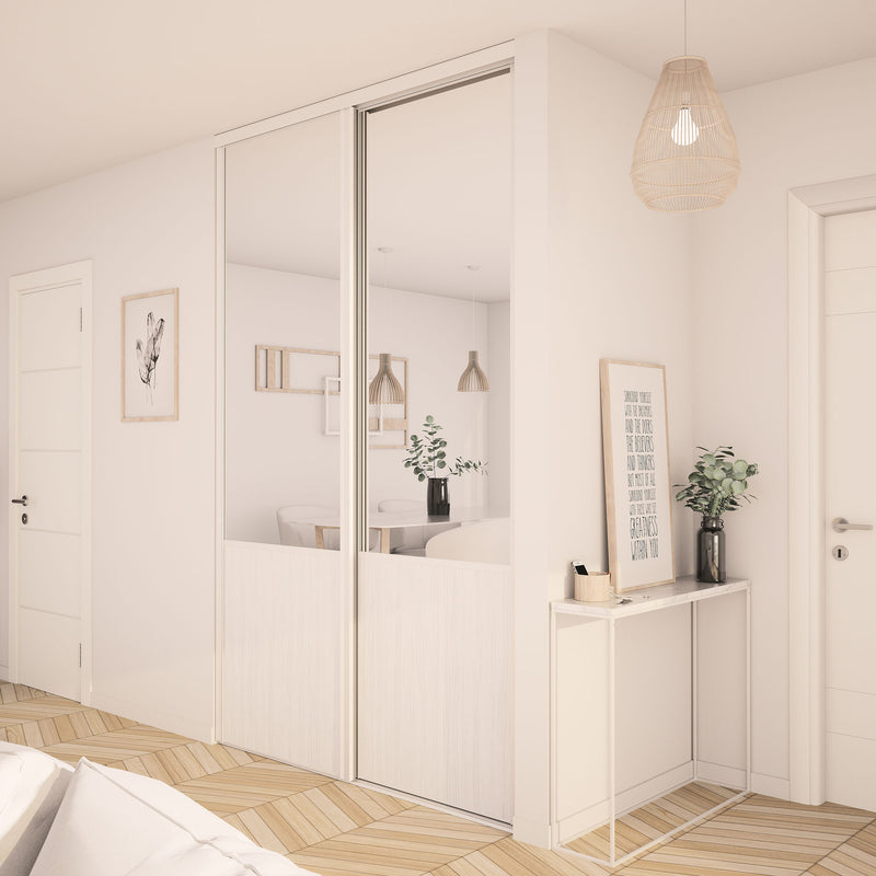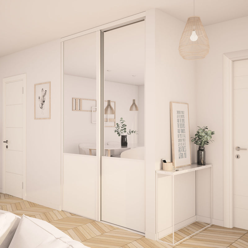 Façade de placard coulissante 2 portes miroir argent, décor blanc mat