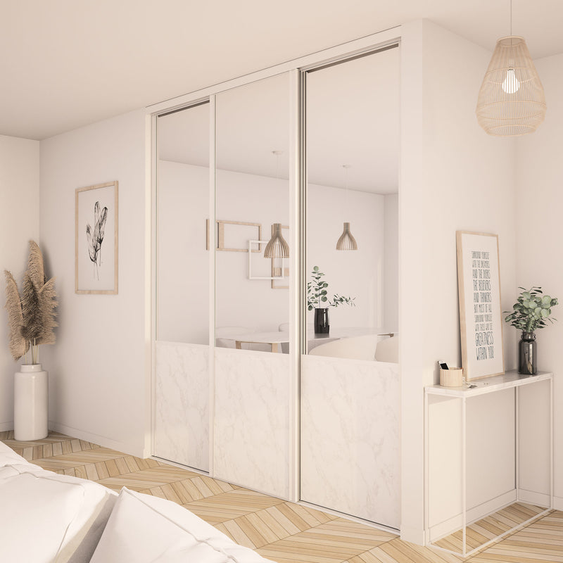 Façade de placard coulissante 3 portes miroir argent, décor marbre blanc