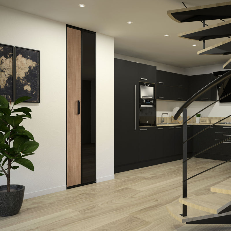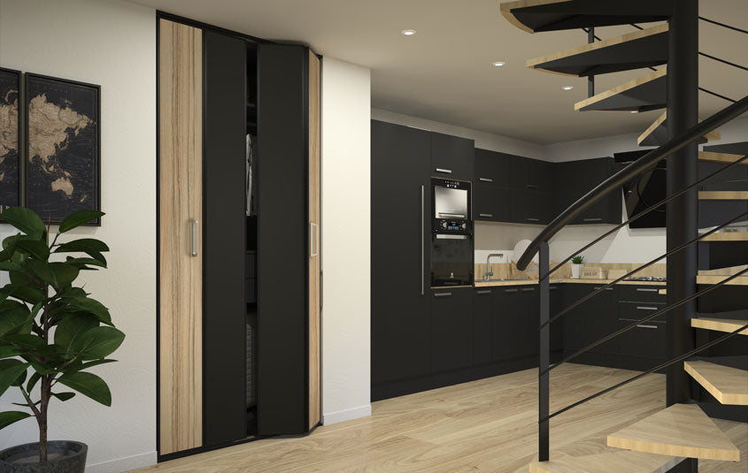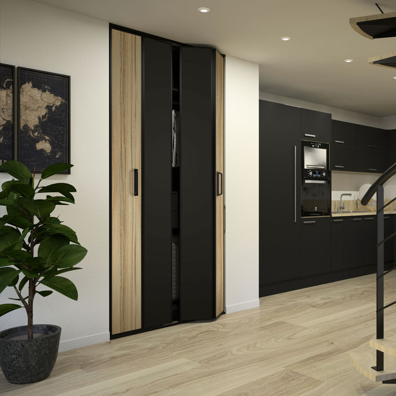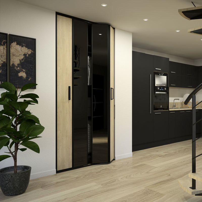 La Collection Gola vous propose un mariage subtil entre différentes essences de bois, plus ou moins clair et le Noir, sous forme de décor ou de verre laqué. Ces façades pliantes, proposées en 1 ou 2 portes, ne manquent pas de caractère et d’authenticité ! Et pour un design épuré et graphique, les finitions en aluminium sont proposées dans la même essence de bois que les portes.