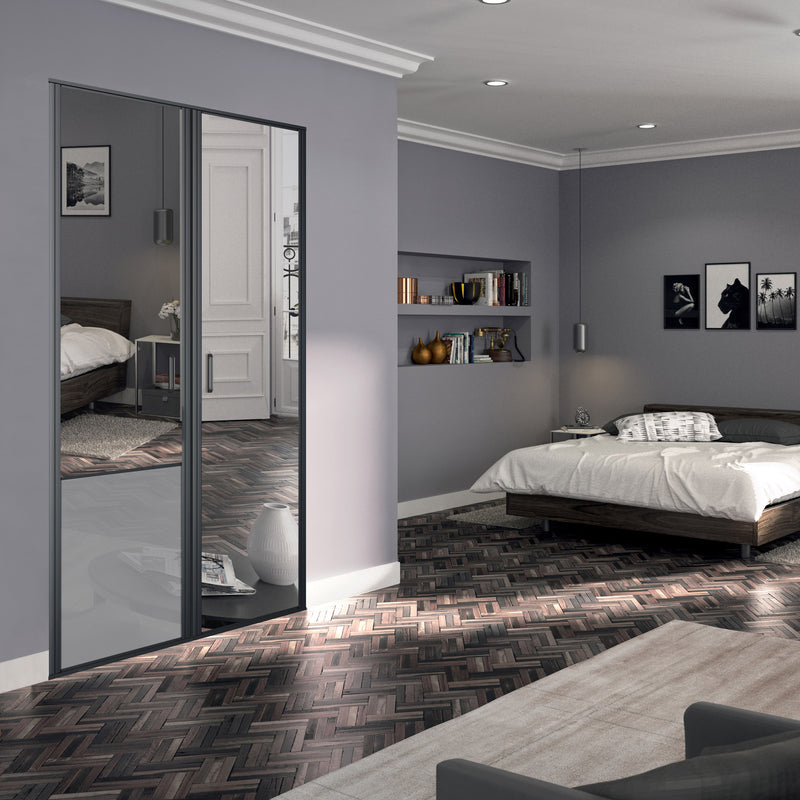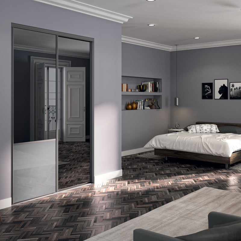 Façade de placard coulissante 2 portes miroir plomb, décor gris intense