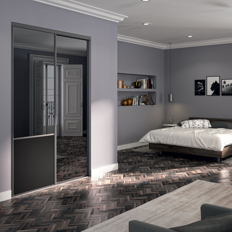 Façade de placard coulissante 2 portes miroir plomb, verre laqué gris foncé
