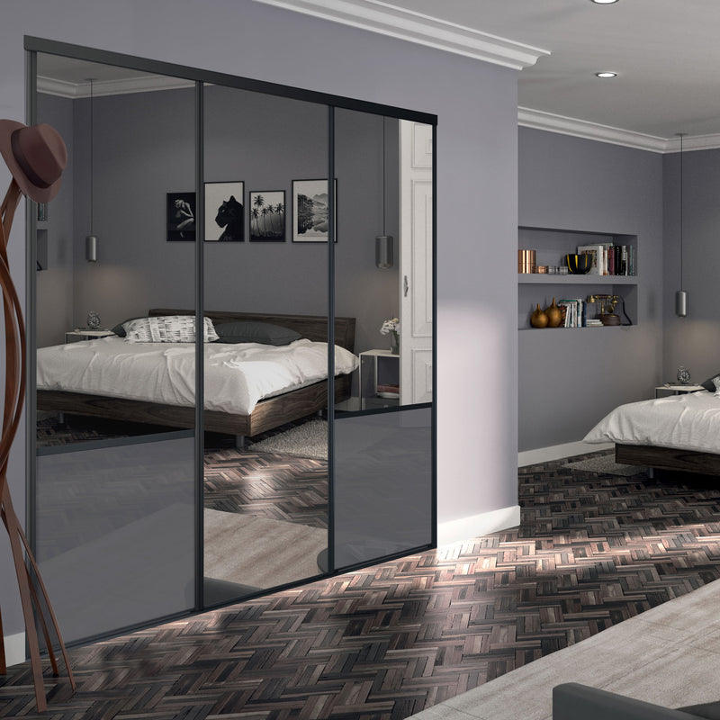 Façade de placard coulissante 3 portes miroir plomb, verre laqué gris foncé
