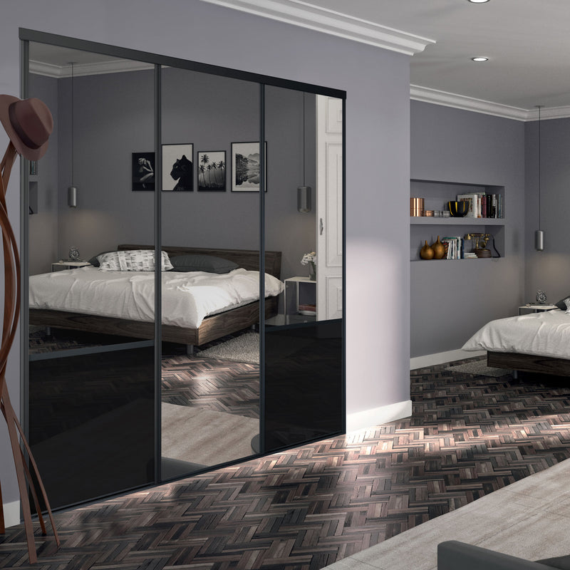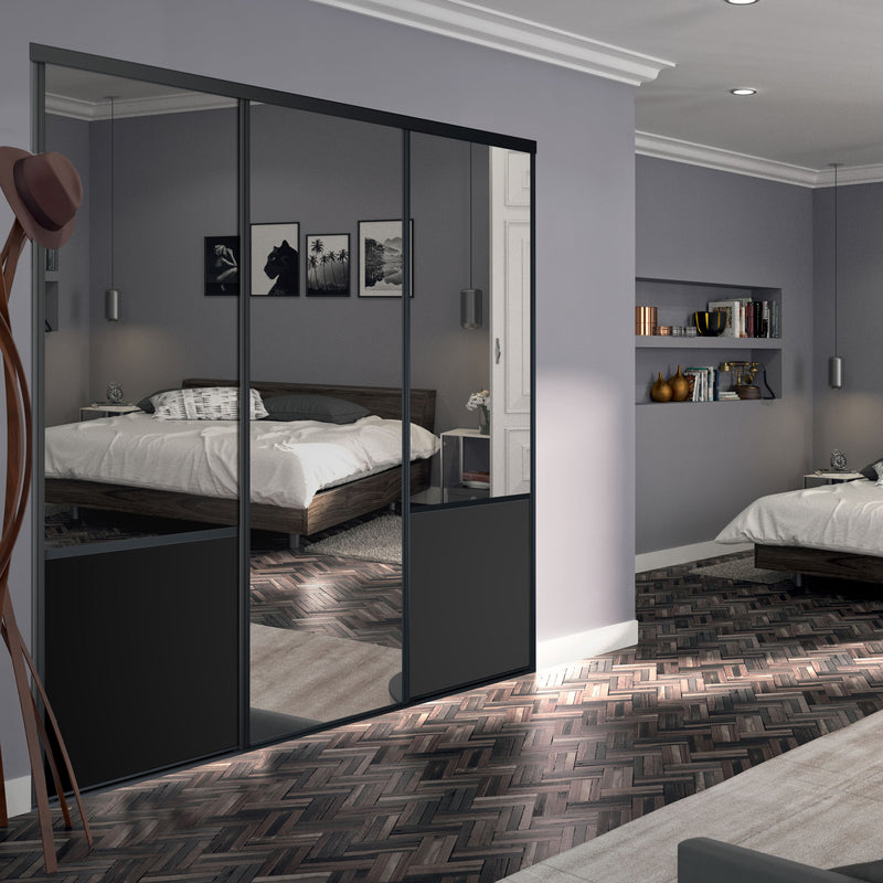 Façade de placard coulissante 3 portes miroir plomb, décor noir intense