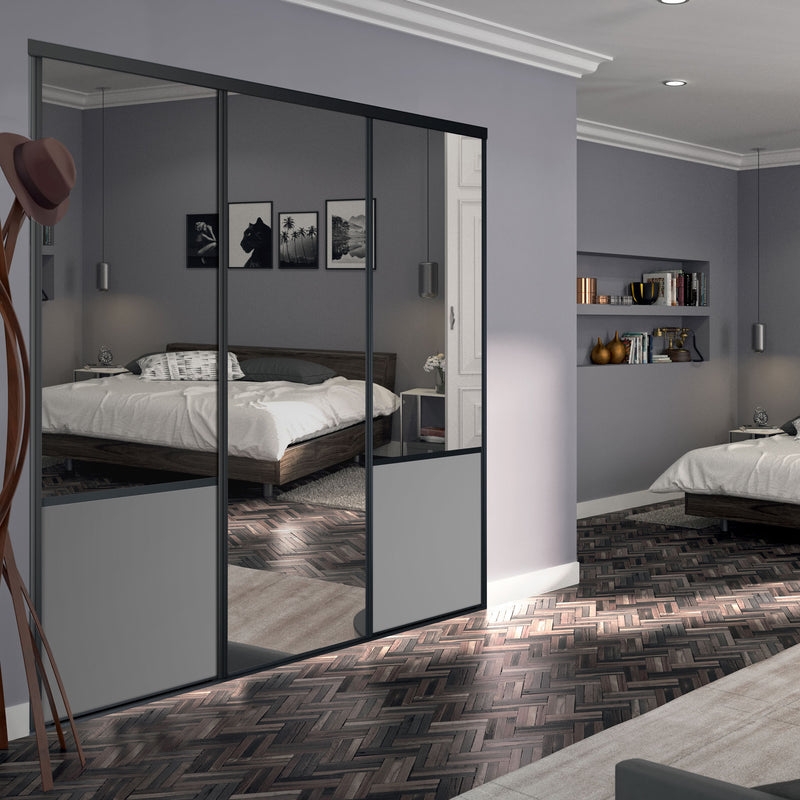 Façade de placard coulissante 3 portes miroir plomb, décor gris intense