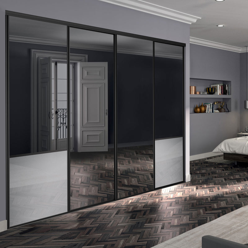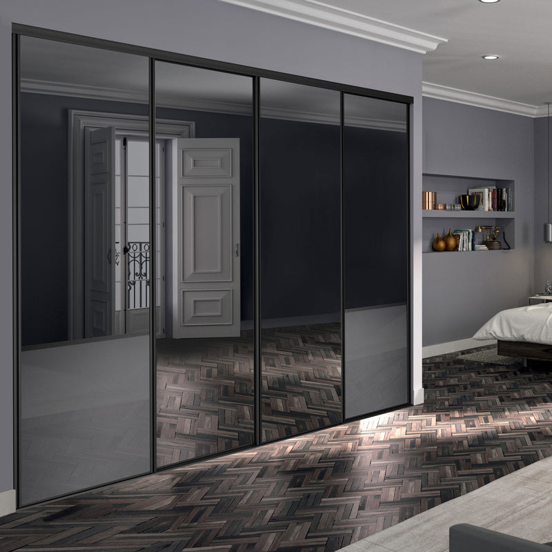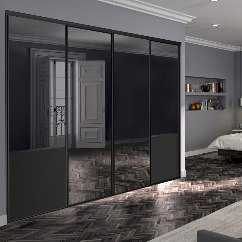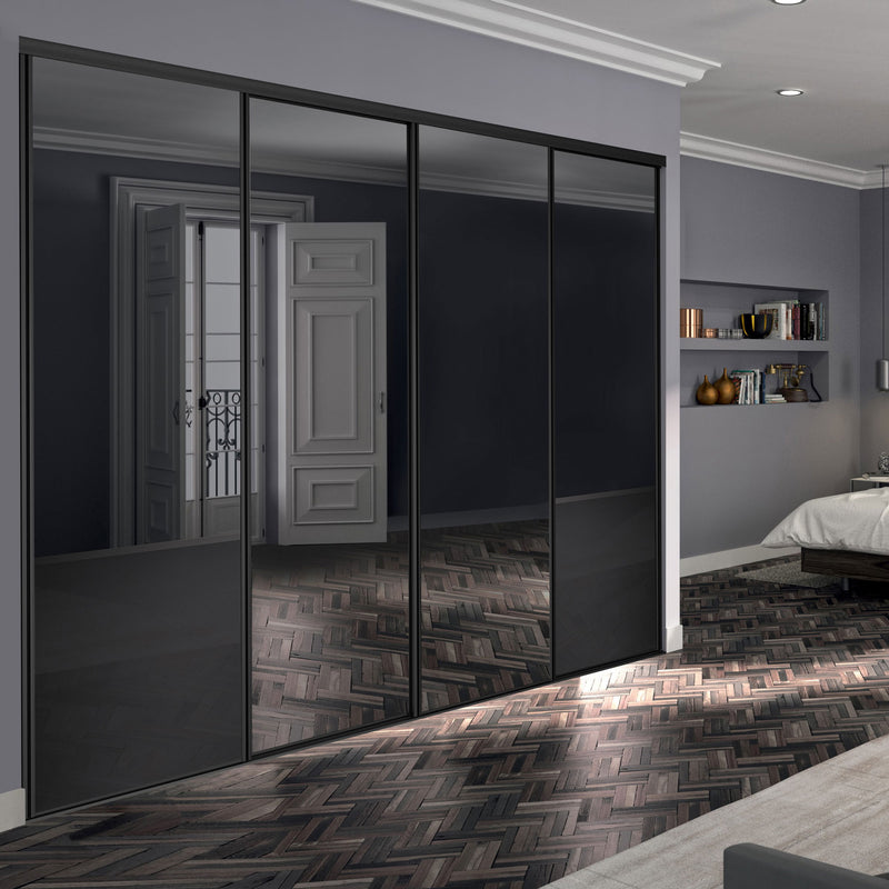 Façade de placard coulissante 4 portes miroir plomb, verre laqué noir