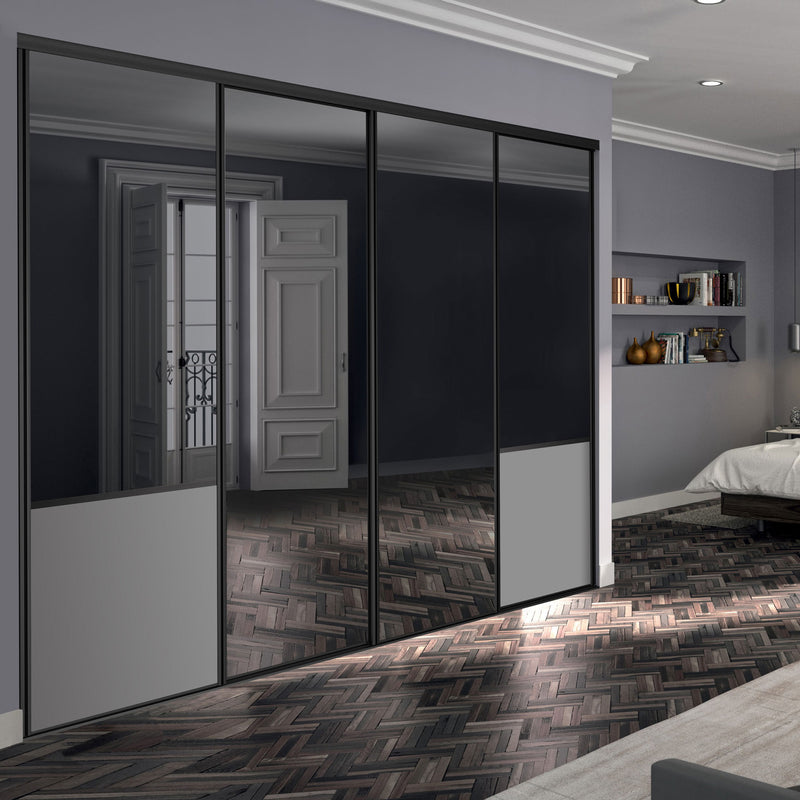 Façade de placard coulissante 4 portes miroir plomb, verre laqué gris foncé