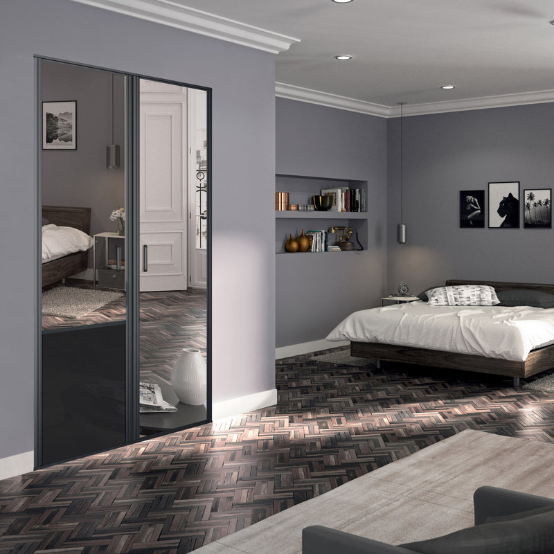 Façade de placard coulissante 2 portes miroir plomb, verre laqué noir