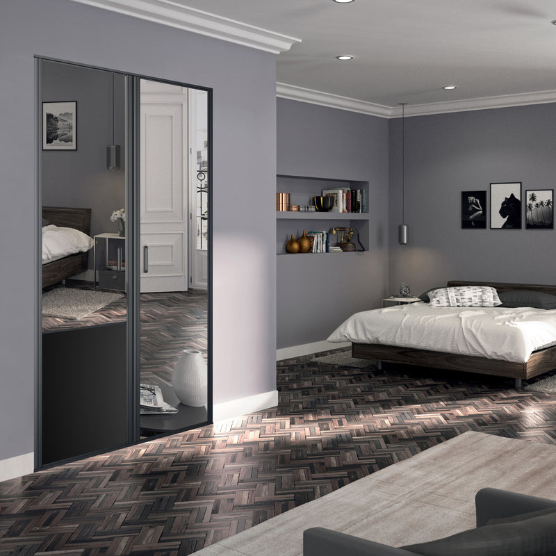 Façade de placard coulissante 2 portes miroir plomb, décor noir intense