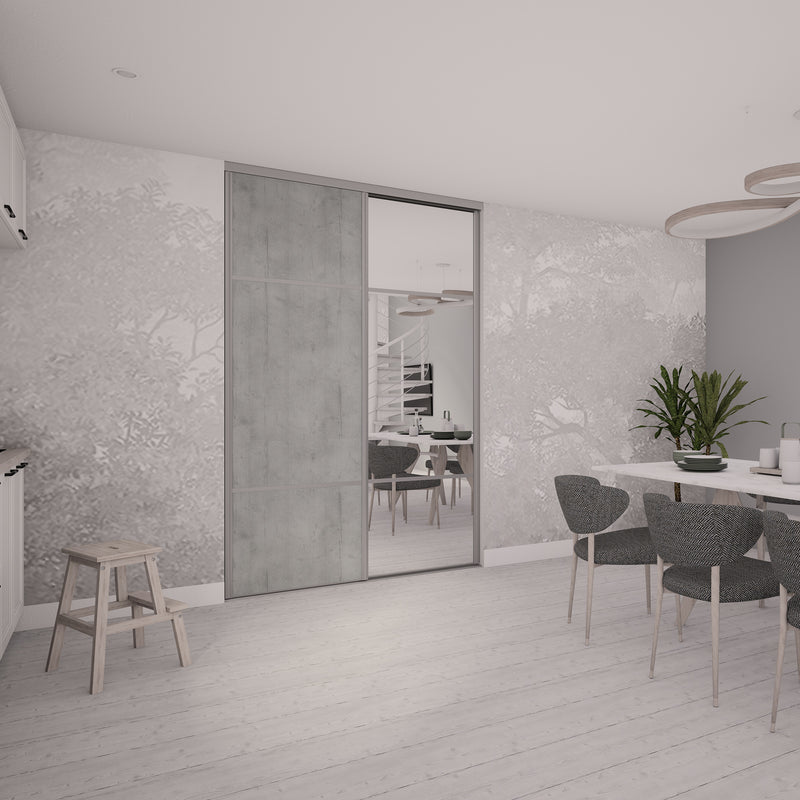 Façade de placard coulissante 2 portes décor béton wood, miroir argent
