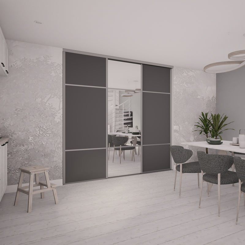Façade de placard coulissante 3 portes décor gris anthracite, miroir argent